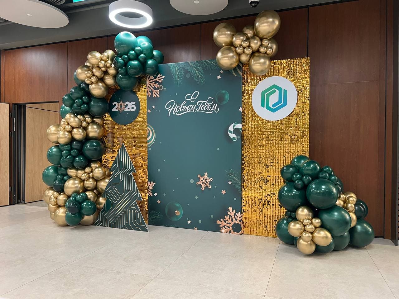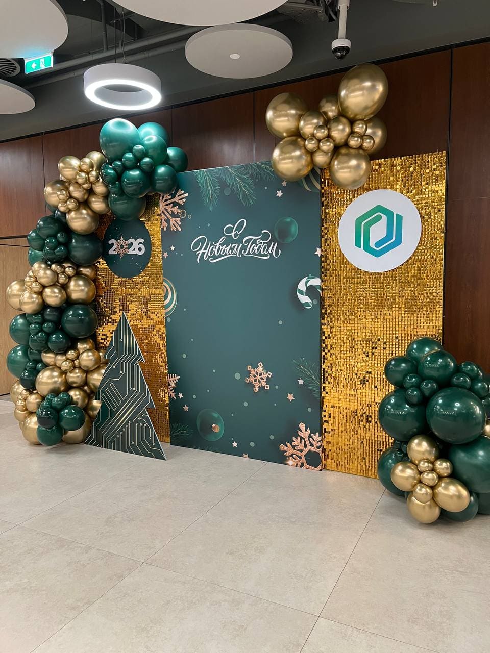 Элегантная новогодняя фотозона в благородной изумрудно-золотой палитре — стильное решение для корпоративного праздника, офиса или делового мероприятия. Центральный баннер с надписью «С Новым годом» украшен зимними элементами и цифрами 2026, а по бокам композицию дополняют золотые пайеточные панели, создающие эффект роскоши и праздничного блеска.