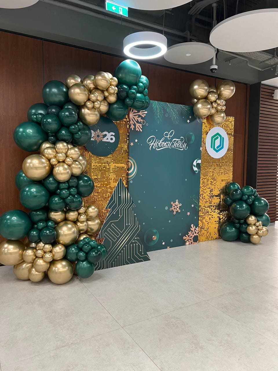 Воздушные гирлянды из шаров разных размеров в оттенках изумруда и золота придают объём и динамику, а декоративная ёлка гармонично завершает образ. Идеально подходит для фотосессий, встреч гостей и создания атмосферного новогоднего настроения.