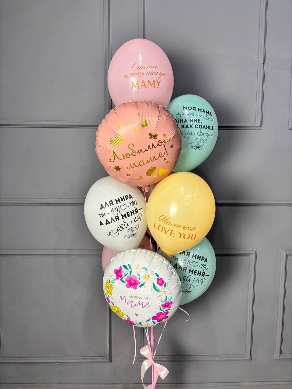 Трогательный букет из воздушных шаров, наполненный теплом и любовью, — идеальный подарок для самой дорогой мамы. Композиция выполнена в нежной пастельной гамме с розовыми, мятными, молочными и жёлтыми оттенками. Каждый шар украшен тёплыми надписями и признаниями, а центральный фольгированный шар с цветочным дизайном подчёркивает особенность и душевность подарка.