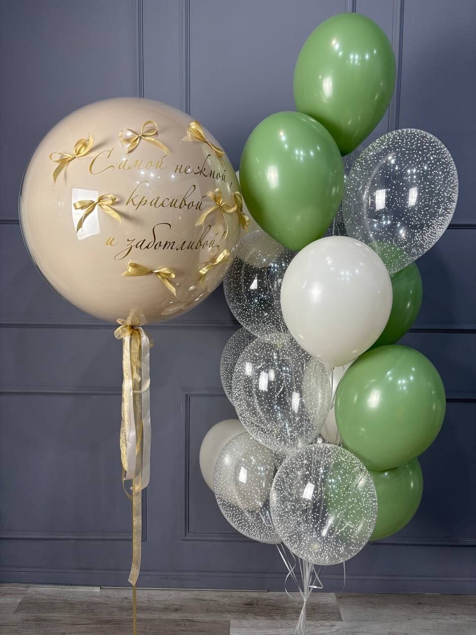 Стильный набор шаров в пастельно-зелёных и кремовых оттенках. В составе прозрачные шары с конфетти, классические латексные шары и большой шар с надписью и декоративными бантиками. Идеальный подарок для девушки, мамы, жены или подруги. Смотрится утончённо, воздушно и очень празднично.
