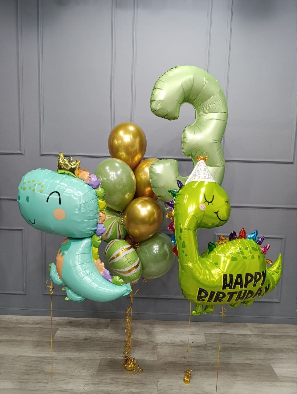 Стильная и весёлая композиция из воздушных шаров с милыми динозаврами и большой цифрой 3 в нежно-зелёном цвете. В набор входят два фольгированных динозавра, крупная цифра, а также связка шаров в зелёно-золотой гамме с декоративными элементами.