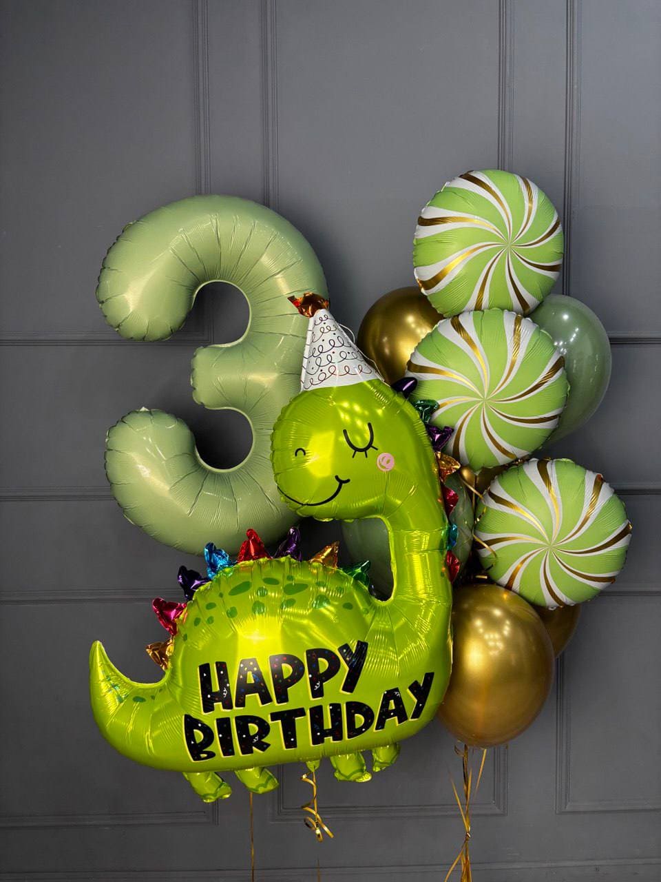 Яркая и милая композиция из воздушных шаров с фольгированным динозавриком в праздничном колпачке — идеальный вариант для детского дня рождения. Большой шар в форме динозавра с надписью Happy Birthday становится главным акцентом композиции и сразу вызывает восторг у ребёнка.