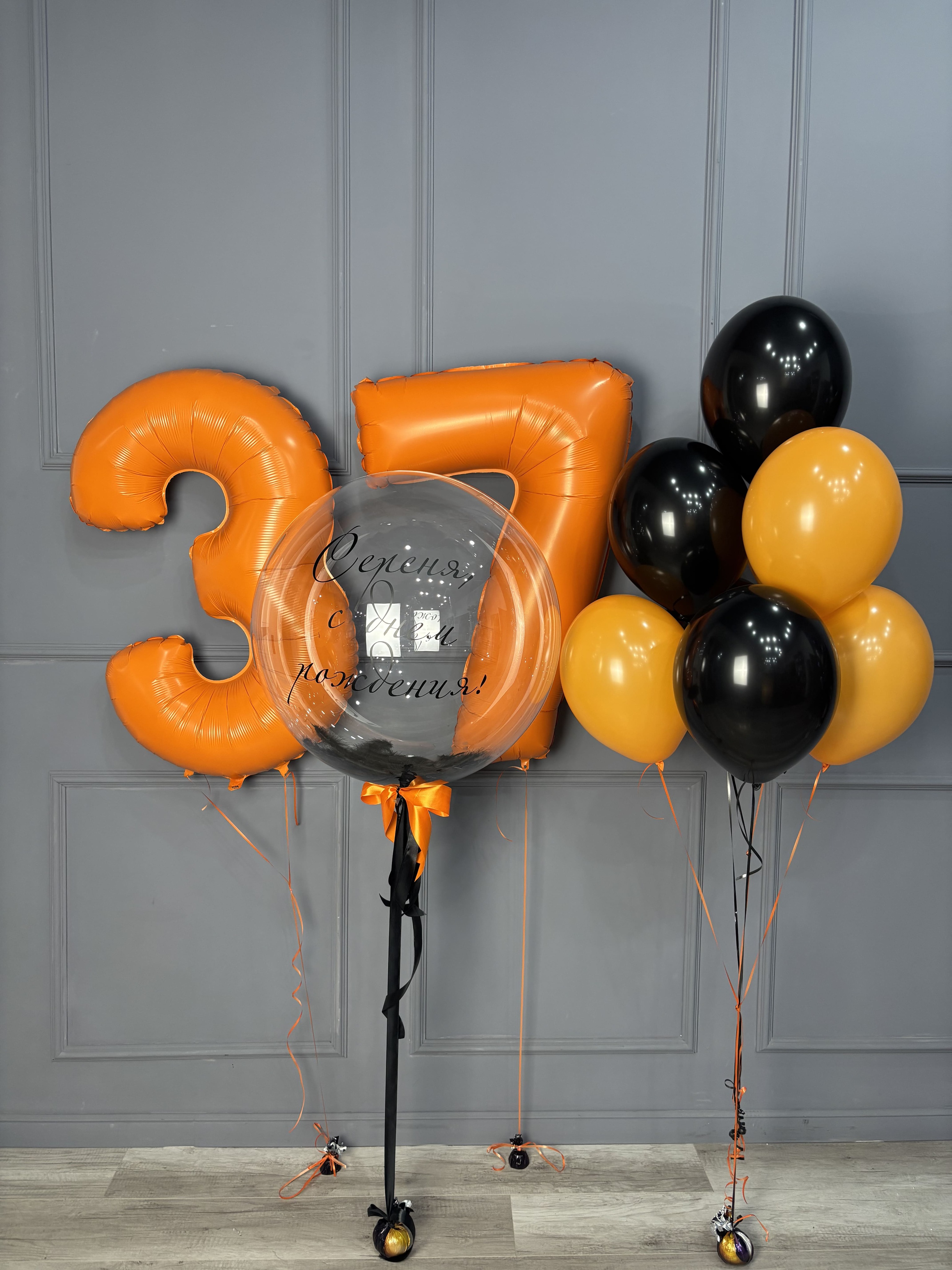 В центре композиции — большой прозрачный шар с индивидуальной надписью «С днём рождения!», дополненный атласными лентами. Композицию обрамляют фольгированные цифры 37 насыщенного оранжевого цвета и связка латексных шаров в чёрно-оранжевой гамме.