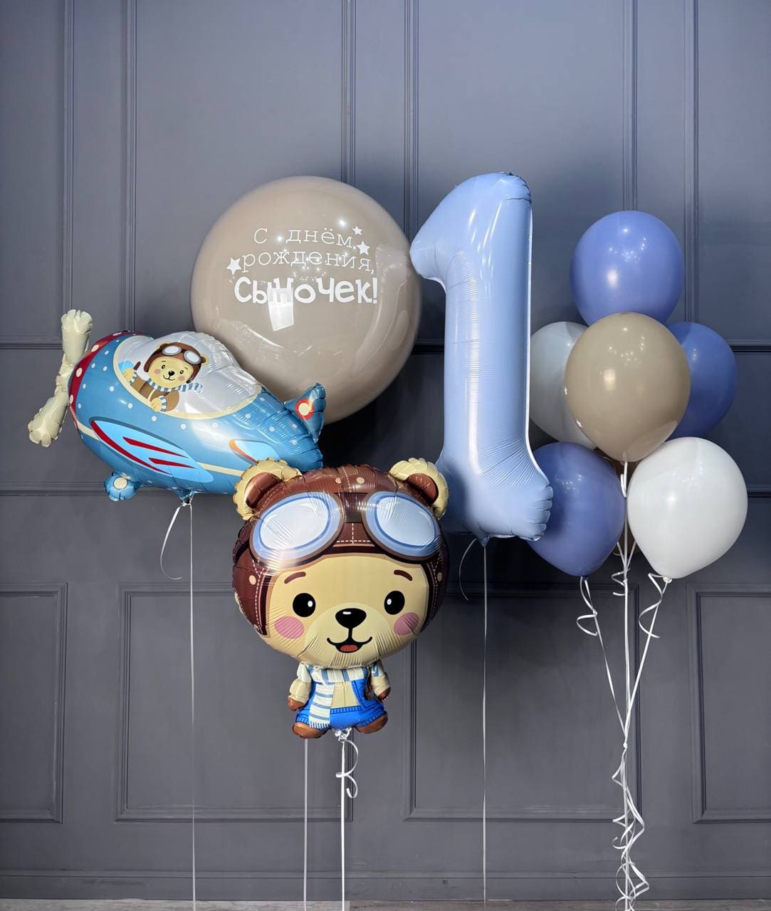 В набор входит большая фольгированная цифра «1» в голубом цвете, шар с надписью «С Днём Рождения, сыночек!», а также очаровательные фигуры мишки-пилота и самолётика. Композицию дополняют латексные шары в голубых, бежевых и белых оттенках.
