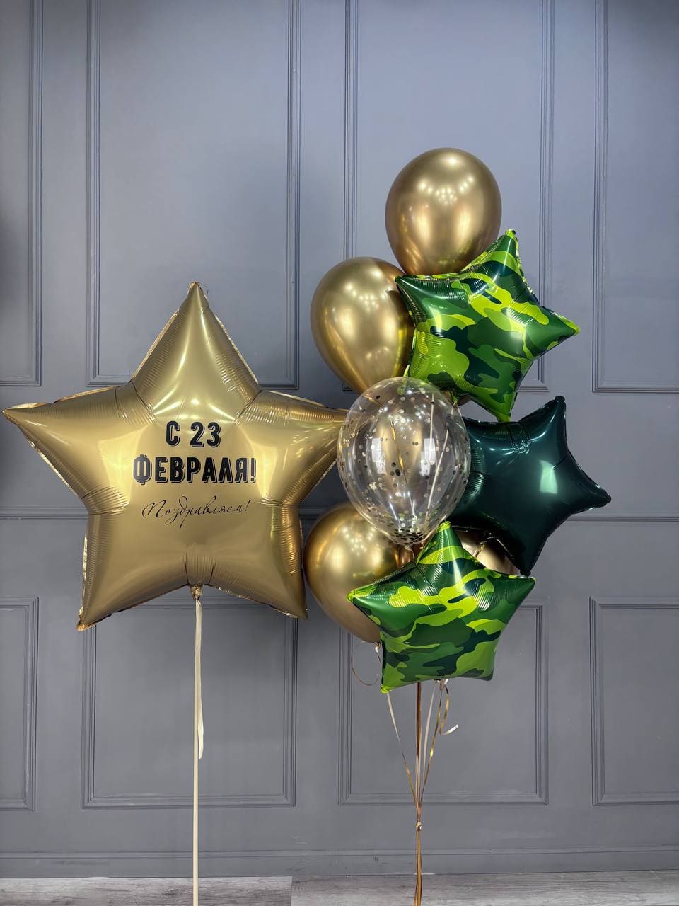Стильная композиция из фольгированных и латексных шаров в золотых и камуфляжных оттенках — эффектное поздравление с 23 февраля. В набор входит большая золотая звезда с надписью «С 23 февраля!», звёзды в камуфляжном и тёмно-зелёном цвете, прозрачный шар с конфетти и золотые шары.