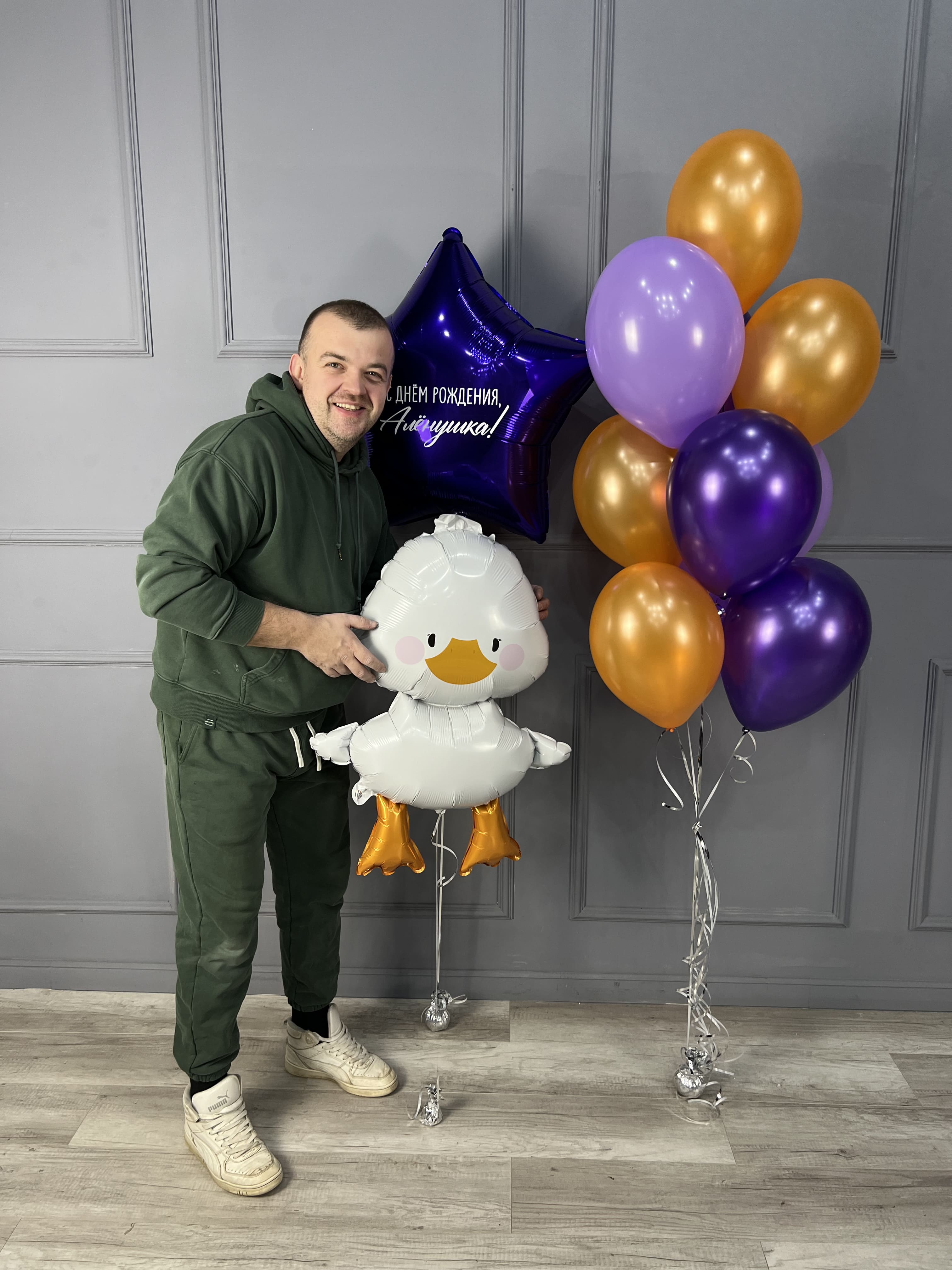 Стильная композиция из воздушных шаров в фиолетово-золотой гамме с очаровательным фольгированным утёнком. В набор входит большая звезда с индивидуальной надписью, связка латексных шаров в насыщенных сиреневых и золотых оттенках, а также милый объёмный утёнок, который станет главным акцентом праздника.