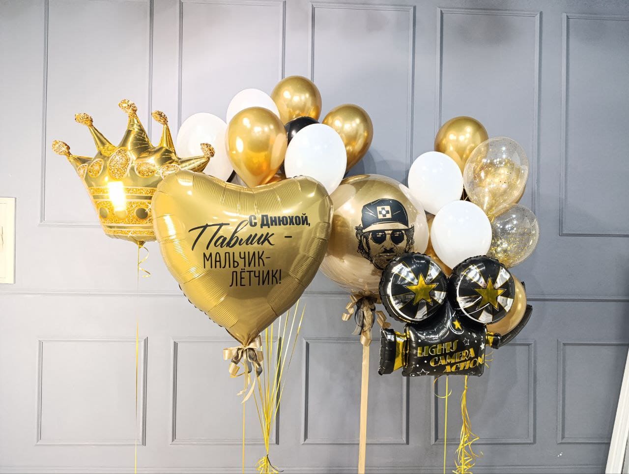 Эффектная композиция из воздушных шаров в чёрно-бело-золотой гамме для яркого и стильного дня рождения. Главный акцент — большое золотое сердце с индивидуальной надписью и фольгированная корона, которые создают атмосферу настоящего праздника для именинника.