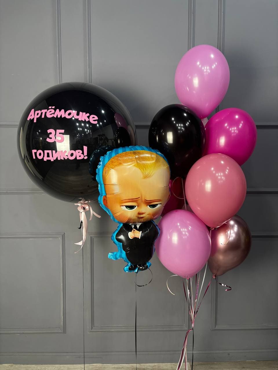 Стильный фонтан шаров для яркого и запоминающегося праздника 🎉В композиции — эффектный чёрный шар с индивидуальной надписью, связка латексных шаров в розово-чёрной гамме и фольгированная фигура харизматичного Boss Baby в деловом образе 😎