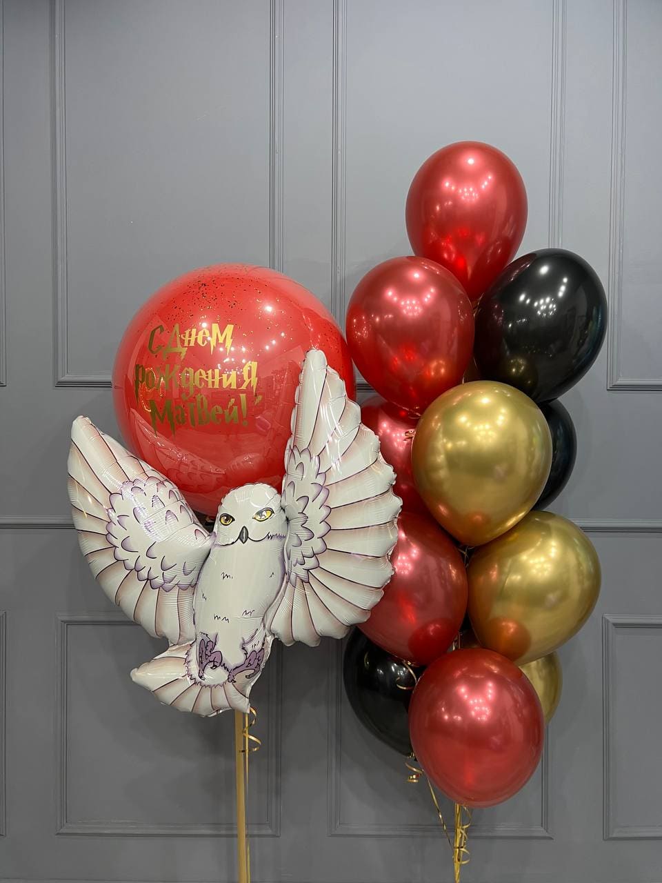Эффектный тематический набор воздушных шаров в стиле волшебного праздника 🪄Композиция с фольгированной совой и большим шаром с индивидуальной надписью станет ярким акцентом дня рождения и идеально подойдёт для поклонников магической атмосферы.