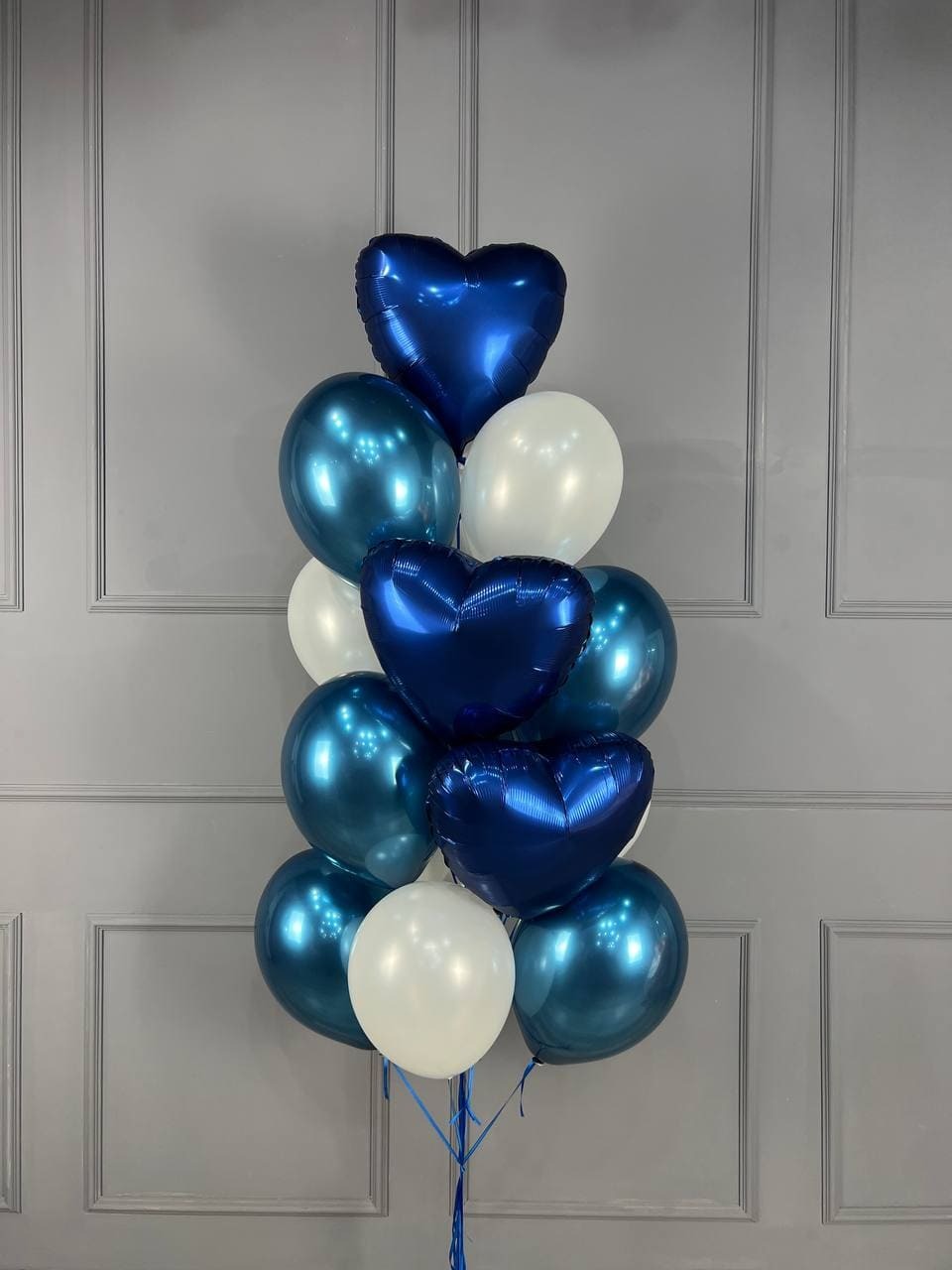 Элегантный набор шаров в глубоких оттенках синего и белого. В составе — фольгированные сердца и глянцевые латексные шары, создающие эффектный зеркальный блеск. Идеально подойдёт для романтического подарка, годовщины, свидания, фотосессии или украшения зала.