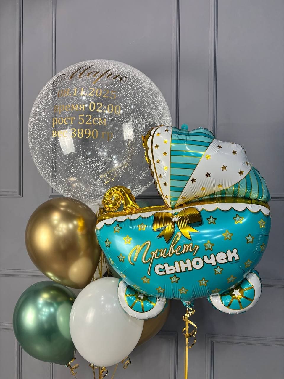 В набор входит большой прозрачный шар с конфетти и индивидуальной надписью (имя, дата, время, рост и вес малыша), а также яркий фольгированный шар в форме коляски с надписью «Привет, сыночек!». Композицию дополняют латексные шары в благородной палитре: золото, белый и глубокий зелёный.
